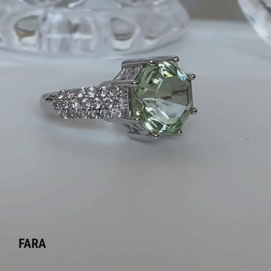 This Ring features a 10mm FARA Gem Pink Amethyst Center gemstone with Natural White Zircon Rounds set on a wide band made with 18K Rose Gold plated Sterling Silver. The Gemstone is Special Patent Cut Gem with eighty star and step cut facets creating brilliant sparkle.